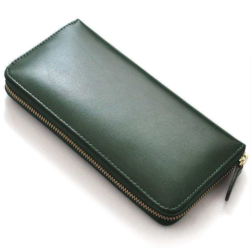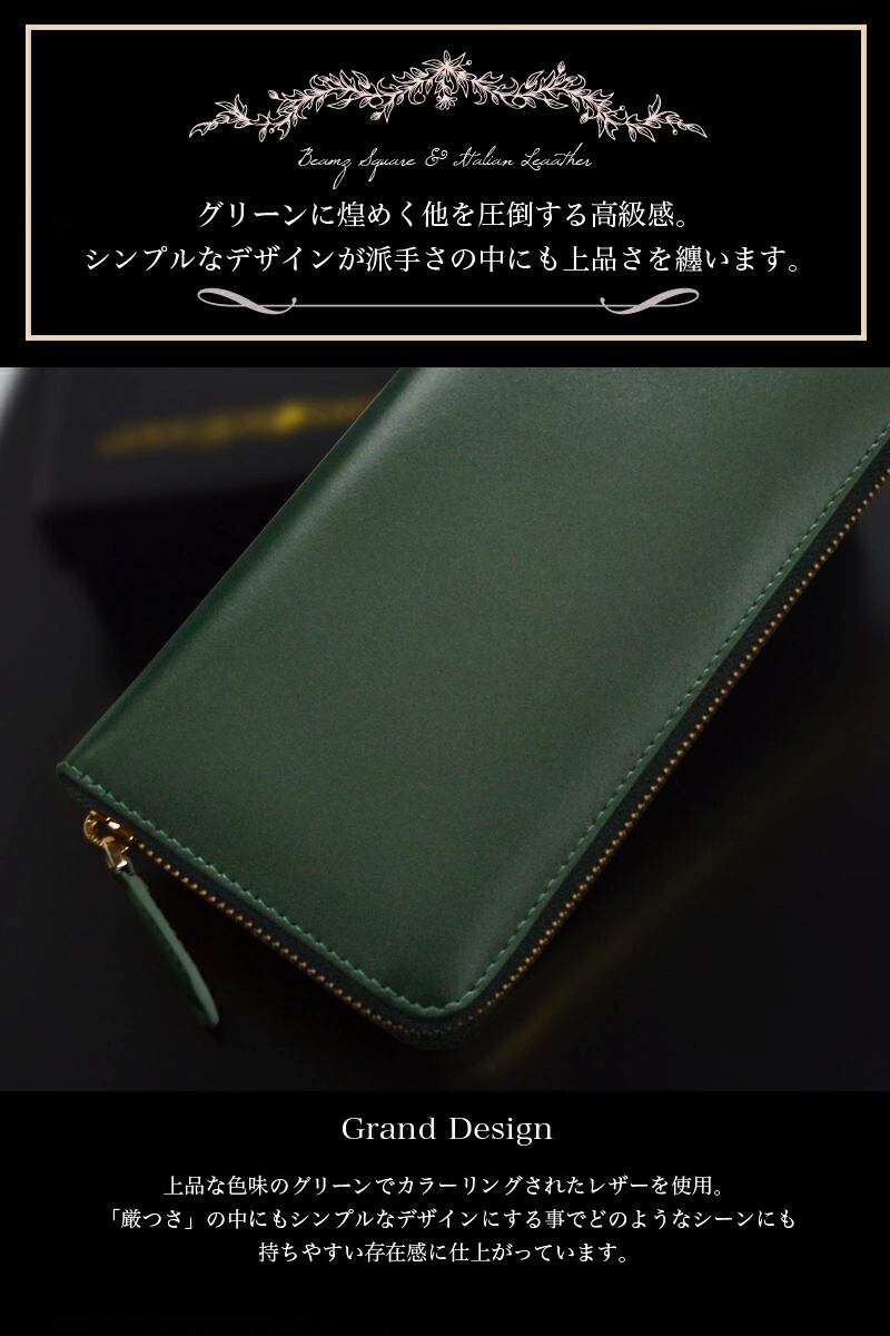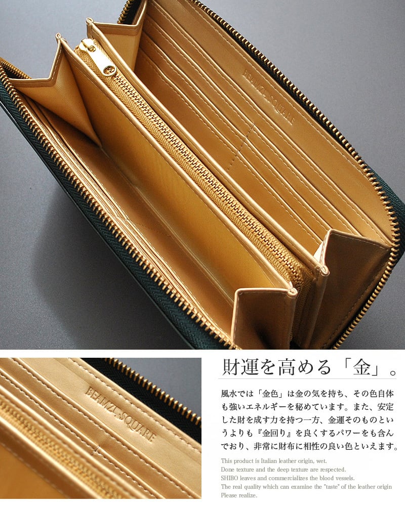 BEAMZSQUARE 牛革グリーン×ゴールド ラウンドファスナー長財布 開運金運財布